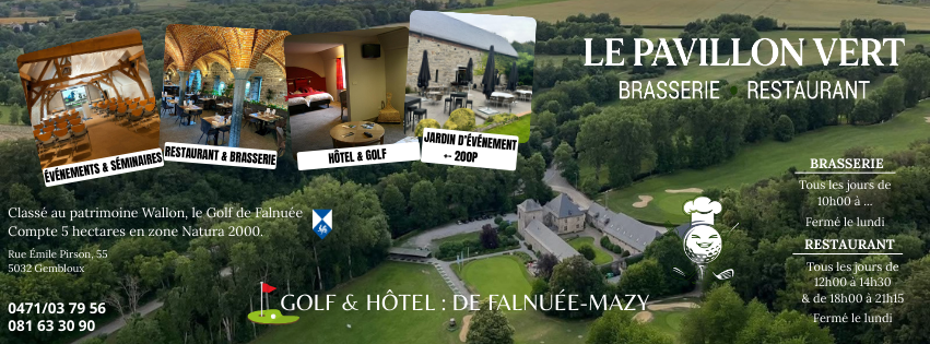 Situé à Mazy(Gembloux), dans un cadre verdoyant et apaisant, le Golf de Falnuée accueille vos séminaires, réunions et événements d’entreprise au sein d’un site classé patrimoine wallon, riche de plus de 750 ans d’histoire.